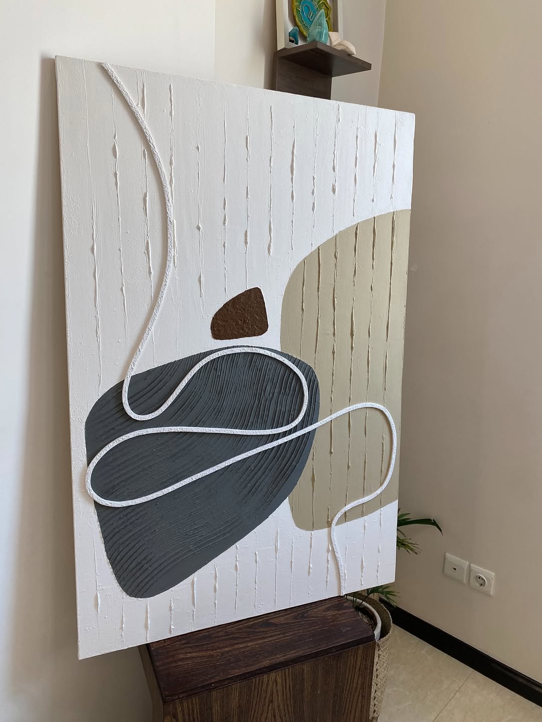 این تابلو مینیمال با ترکیب رنگهای خاکی و خنثی (طوسی زغالی، کرم شنی، قهوهای گرم و سفید) میتونه به هر فضایی آرامش و هارمونی بده. طراحی و بافت برجستهی خاصش باعث میشه هم برای دکور مدرن مناسب باشه، هم برای فضاهای مینیمال و شیک. رنگها و سایز رو میتونم دقیقاً مطابق سلیقه و دکور شما شخصیسازی کنم، تا یک اثر هنری منحصربهفرد مخصوص خودتون داشته باشید. ابعاد: ۸۰*۱۲۰
